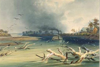 On December 16, shortly after the New Orleans had entered the Mississippi, the New Madrid earthquake hit. This earthquake, which was actually an extended period of severe tremors, has been estimated up to an 8.0 on the Richter scale basically reshaped the Midwest. The entire channel of the Mississippi was erased, the course of the river changed dramatically. For about an hour after the most severe tremors the river actually ran backwards. Jack, the pilot, had no idea where he was and soon found himself navigating the boat over areas that only hours before had been fields or forests. Whole sections of the shore were dropping into the river, islands appeared and disappeared. Tiger the dog would often give warning of a fresh tremor by putting his head in Lydia’s lap before it hit.