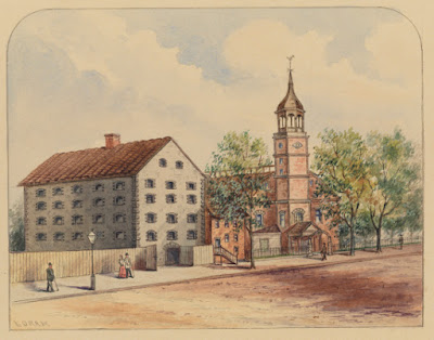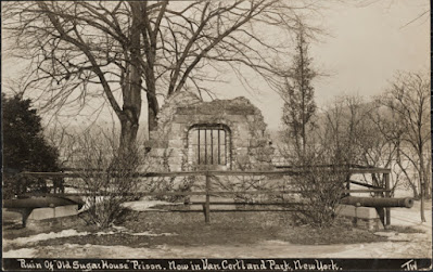 At the end of the 19th Century it was decided to memorialize the prisoners who died at the Sugar House Prison. Two barred windows were saved from the recently demolished Rhinelander Sugar House, which ironically was not used as a prison during the Revolution because it was run by a loyalist named Cuyler. One window was mounted on New York City Police Headquarters at One Police Plaza
